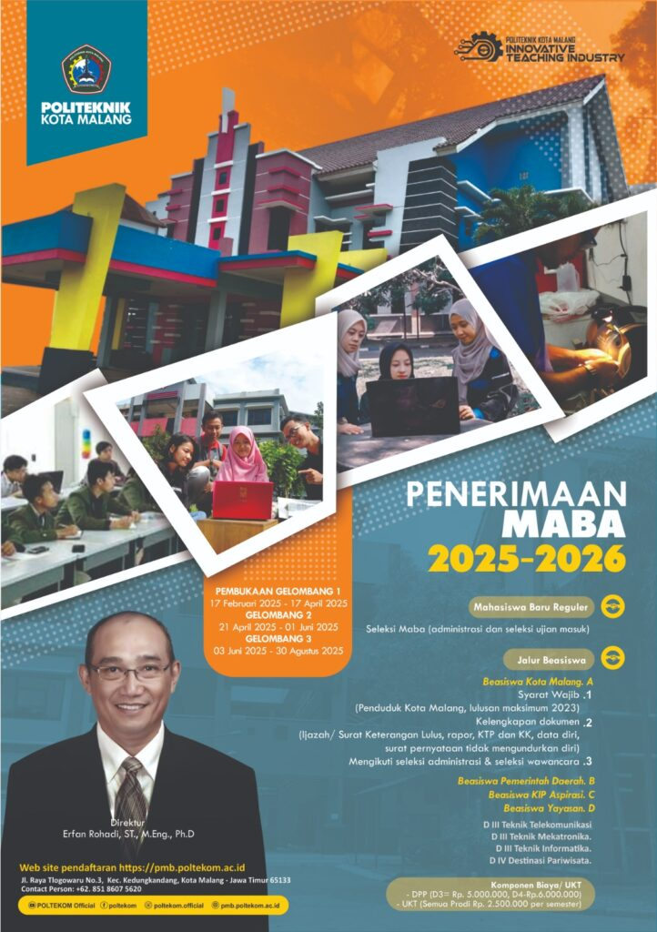 Bagi yang berniat melanjutkan kuliah di Politeknik Kota Malang, Pendaftaran mahasiswa baru tahun ajaran 2025/2026 sudah dibuka. Pendaftaran bisa dilakukan secara online, Jurusan yang tersedia adalah Teknik Informatika, Teknik Telekomunikasi, Teknik Mekatronika, Destinasi Pariwisata